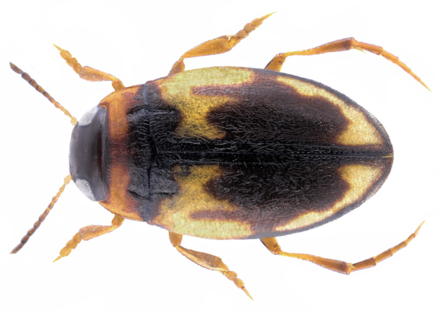 Morfologia: lunghezza 2-2,2 mm. Corpo piccolissimo, allungato, moderatamente convesso sopra e sotto, con la massima larghezza prima della metà delle elitre; superficie superiore con evidente microscultura e con pelosità appressata su pronoto ed elitre; pronoto con un solco laterale profondo che si continua in un analogo solco elitrale. Colorazione generale: di sotto nerastra ad eccezione del prosterno e del capo che sono giallo-rossastri; capo bruno; antenne giallastre alla base e annerite nella metà apicale; palpi giallastri con ultimo articolo di quelli labiali più scuro; pronoto giallo-rossastro con una larga fascia trasversale basale scura che prosegue nelle elitre con una fascia analoga; elitre giallastre con fascia basale trasversale scura contigua alla fascia del pronoto, una fascia longitudinale scura compresa fra le 2 strie suturali e una larga macchia scura (più o meno provvista di digitazione verso la base elitrale e lacune verso il margine) che da circa la metà delle elitre si spinge verso l’apice elitrale; zampe giallo-rossastre. Capo: largo e appiattito, bruno, microreticolato e punteggiato; occhi grandi. Pronoto: largo, poco convesso, microreticolato e punteggiato, con pelosità appressata un po’ rada, ai lati provvisto di un profondo solco longitudinale che dalla base arriva fino a quasi la metà del pronoto; margine debolmente convesso in avanti, ai lati fortemente sporgente verso gli occhi; margini laterali quasi diritti e arrotondati in avanti e con sottilissimo bordo; margine posteriore ai lati fino ai solchi laterali, inclinato all’indietro, poi quasi diritto. Zampe: snelle; le anteriori e medie con tibie fortemente dilatate e compresse verso l’apice, le posteriori non adattate al nuoto; tarsi di 5 articoli; gli anteriori e i medi apparentemente con soli 4 articoli in quanto il quarto è contenuto nella smarginatura del terzo. Elitre: allungate, poco convesse, con massima larghezza prima della metà, microreticolate, punteggiate, con pelosità appressata un po’ rada; stria suturale profonda e diritta, da dietro lo scutello fin quasi all’apice elitrale; ai lati sono presenti 2 profondi solchi basali laterali lunghi poco più dei solchi del pronoto e con questi in contatto. Dimorfismo sessuale: non evidente.