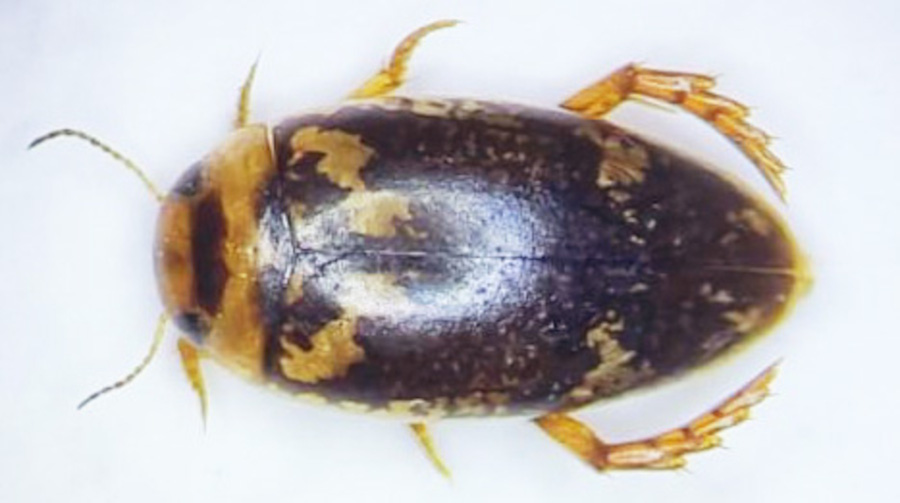 Morfologia: lunghezza 3,5-4 mm. Corpo piccolissimo, allungato, coi lati regolarmente arrotondati, ugualmente convesso sopra e sotto; massima larghezza circa alla metà; superficie superiore lucida, con microscultura evidente; punteggiatura molto scarsa. Colorazione generale: capo giallastro; pronoto giallastro con una macchia trasversale scura dietro il bordo anteriore e davanti a quello posteriore; elitre bruno-nerastre con margini laterali, 4 macchiette dietro il bordo anteriore, 2 macchiette verso l’apice e macchiette minori, giallastri; zampe giallo-rossastre; antenne giallastre con metà distale scurita; palpi gialli con ultimo articolo scurito all’apice. Capo: molto largo, convesso e assai regolarmente arrotondato, con microscultura minuta e debole; occhi perfettamente inseriti nel profilo del capo; antenne molto allungate e gracili con articoli molto più lunghi che larghi. Pronoto: molto largo, convesso, con microscultura evidente; margine anteriore debolmente convesso e, ai lati, sporgente verso gli occhi; margini laterali arrotondati e privi di bordo; margine posteriore ai lati debolmente sinuoso e inclinato indietro verso la sutura elitrale. Zampe: le anteriori e medie snelle, le posteriori tozze, estremamente adattate al nuoto, con femori, tibie e tarsi molto appiattiti; tarsi di 5 articoli; gli anteriori nei maschi coi primi 3 articoli un po’ dilatati; tarsi posteriori con articoli provvisti all’angolo posteriore esterno di un lungo lobo. Elitre: allungate, regolarmente convesse, con massima larghezza davanti alla metà e ristrette all’apice; lati arrotondati; microscultura molto evidente; punteggiatura scarsa e rappresentata da 3 serie longitudinali e poco distinte di punti radi e superficiali che nella parte posteriore sono distribuiti in modo confuso. Dimorfismo sessuale: primi 3 articoli dei tarsi anteriori debolmente dilatati nel maschio.
