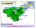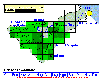 4.4 - Carte di distribuzione: quelle pubblicate riguardano un numero limitato di specie e risultano aggiornate al 1999. Per le spiegazioni vedi illustrazioni riportate a fianco. Nella carta la zona di studio è stata suddivisa in quadrati di 5x5 km appartenenti al reticolo di riferimento del Sistema UTM (Sistema Universale Trasverso di Mercatore) ED50 e compresi nelle maglie fondamentali di 100 km di lato TJ e UJ della zona 33T.
