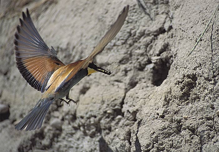 Dati accertati nella zona di studio (bacino del Metauro, basso corso del T. Arzilla e litorale di Fano): stato fenologico: specie migratrice e nidificante (M, B). Nidificazioni certe (genitori con imbeccata e nidi in cunicoli scavati in scarpate sabbioso-argillose). Frequenza di osservazione: scarsa, in aumento dal 1995. Osservazioni: dal 1979 al 2025, da maggio a metà settembre. Nella zona di studio frequenta campi coltivati con alberature e siepi in pianura e collina e lo spazio aereo sopra gli specchi d'acqua. Per la nidificazione sceglie zone dal piano a 500 m circa di quota dove sono presenti scarpate adatte. La distruzione delle scarpate a ridosso dell’acqua, anche legata a sistemazioni idrauliche, ne impedisce la nidificazione ed ha ridotto il numero delle colonie. Basso bacino: Fosso delle Caminate in Comune di Fano, una nidificazione occasionale nel 1979 (TRAPPOLI, com. pers.). S. Angelo in riva destra del Metauro a 6 km dalla foce, una colonia con 10 individui nidificante su una ripa argilloso-arenacea (BIANCHI, 1996). Metauro a 10 km dalla foce in un’area di frantoio a ridosso del fiume, una colonia con circa 70 nidi nel 1995-1998, scavati nelle pareti subverticali di un cumulo di sabbia consolidata (DIONISI). Dintorni di Centinarola nella valle del T. Arzilla presso Fano, una coppia nel 1996, due nel 1997 e quattro nel 1998 (FALCIONI, com. pers.). Colline di Candelara-Novilara sulla sinistra del T. Arzilla, un sito occupato dal 2002 al 2004 con almeno 9 coppie (GIACCHINI, com. pers.). A partire dal 2003-2004 sono stati osservati vari altri siti di nidificazione nel basso Metauro a 3-4 km dalla foce, in scarpate a ridosso dell'alveo fluviale (CAVALIERI, com. pers.) e a Montemaggiore in Comune di Colli al Metauro sulla parete di una ex cava (POGGIANI). Area alberata di Casa Archilei alla periferia di Fano, un gruppo numeroso (anche un centinaio) di individui nel periodo fine giugno-primi settembre 2025 ha scelto come dormitorio e luogo di sosta l'area fittamente alberata di Casa Archilei alla periferia di Fano, frequentando anche lo spazio aereo circostante. Medio bacino e zona appenninica interna: Fossombrone, una colonia vicino al centro abitato nel maggio 2017 (LELI, com. pers.). Metauro vicino alla confluenza con il Candigliano, una colonia con circa 20 nidi nel 2016 (GIACCHINI, com. pers.). Dintorni di Cantiano, due coppie nel giugno 1993 nidificanti in una scarpatella di 30 cm di altezza e almeno una copia nel giugno 2024 (LELI, com. pers.).