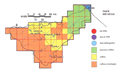 Nelle carte di distribuzione sono indicati con cerchi rossi i dati di presenza delle specie dal 2000 al 2024 e con cerchi viola i dati di presenza dal 1975 al 1999 (considerati “storici”); in caso di sovrapposizione, viene riportato il dato più recente. Sono indicati con cerchi azzurri i dati bibliografici, ma solo dove non vi sono dati degli altri due tipi. In pochi casi, se un dato si collocava al confine tra due quadrati di 5x5 km, il simbolo corrispondente è stato segnato su entrambi; se il dato era riferito ad un’area ampia (es. “M. Nerone”) è stato scelto il quadrato centrale.