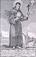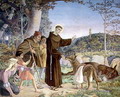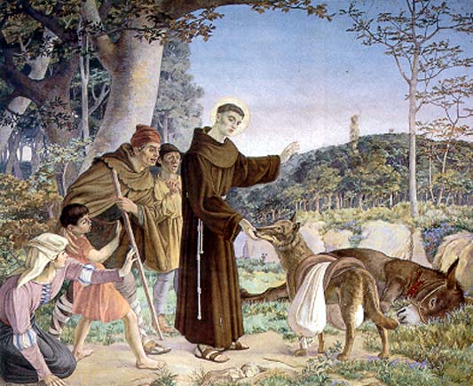 "Giunto il momento di provvedere la legna per il vicino inverno, non essendo ancora di proprietà del convento l'intera selva - lo sarà solo dal 1474 - Fra Sante si porta con il somarello della comunità in alcuni colli vicini selvosi e, fattasi notte, accetta l'ospitalità di un contadino, mentre l'asinello rimane nella selva. Durante la notte un lupo assale l'asinello e lo sbrana uccidendolo. Al mattino Fra Sante, tornato nella selva trova l'asino morto e il lupo che se ne pasce. Armato di fiducia nel Signore, chiama il lupo, lo rimprovera e gl'impone di fare il servizio che faceva l'asino. Così il lupo, divenuto mansueto, per molti anni fino alla morte, carico del basto, presta servizio al convento."