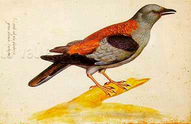 Beccofrusone - Bombycilla garrulus: ''Mi è parso dopo molto tempo volervi inserire ancora il vostro tanto celebrato uccello a noi forastiero afatto, e non mai più veduto eccetto che l'inverno del fìne del 1570 e principio del '71, forse fugito de' paesi freddi e settentrionali per gli troppo freddi e grandissima neve, (...) uccello molto vago de grandezza, un poco più della lodola, di una piuma beretina con un'ombra di rosso, con il becco negro corto e grosso, sotto il gozzo una macchia negra e così intorno agl'occhi, l'ala con qualche macchia negra e bianca e cinericea: nel mezzo di essa vi finiscono per ordine sei penne in una materia sottile longa quanto mezz'onghia e cartuaginosa e rossa la coda con penne rare che finiscono in una ponta lata, quale ha del duretto più che il resto della penna ...'' (6) ''Attorno le palpebre et occhi una macchia negra, sotto alla gola un'altra simile machia maggiore e che tira in aguzzo, con si bello et ellevato o cresta o capello in testa, che il voliamo dire. (...) Nella coda pare che vi habbia rare penne longhette e che in cima vi abbiano il fìne orlato de color giallo, ma pur che sia duretto'' (7).