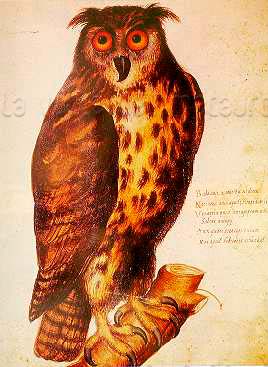 StrigiformiGufo reale - Bubo bubo - Gufo: ''E prima si trova il gufo, forsi bubo degli antichi, che fa de grandissimi danni dove pratica, pigliando lepri, polli, agnelli e simili animali, e fa i suoi nidi in caverne de balze de monti. E' uccello molto grosso, di corpo rotondo con poca coda, di molta piuma e machiata di poco negro con molto arugine e beretinaccio. Il capo è assai grosso, che sopra gli occhi (quali son grandi e de una terribile guardatura) porge in fuora quatro o sei penne a foggia de cornicelli. Se ne servono gli uccellatori per pigliare con il vischio corbi, cornacchie, monacchie et altri simili uccelli alla campagna, che ne pigliano alcuna volta li sacchi pieni in una giornata; et è di corpo como una bon'oca, ma non tanto longo'' (4).