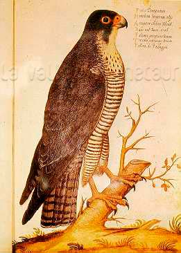 '' ... dopo l'aquila si vedono spesso per questi nostri monti nascere falconi, quali da molti sonno numerati fra l'aquile minore, e non imeritamente. Et è uccello fra' rapaci molto cognosciuto da uccellatori per il suo velocissimo volo et acutissimo vedere (... ). E in Italia e principalmente qua nella nostra regione, como è a Cagli, se ne fanno gran mercantia raccogliendoli da varie parti gran quantità, togliendolo dà nidi, quali poi venuti a perfettione gli portano in carte e barre in Francia (... ). Questo che nasce quivi fa il nido in rupi e balze asprissime d'alti monti, como fa l'aquila, dove per l'ingordigia del guadagno l'homo si sospende con le fune per esse, correndo gran pericolo per havere ditti uccelli'' (5). ''Del quale se ne trovano di quattro sorte fra ucellatori '' (4).