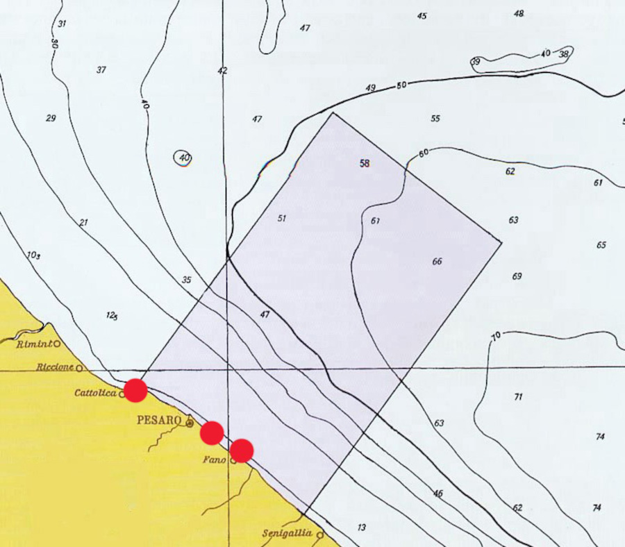 Dati accertati nella zona di studio (Adriatico antistante la Provincia di Pesaro e Urbino sino a 34,5 miglia al largo): tipo di dati: osservaz. esemplari conservati, documentaz. fotografica. Frequenza di osservazione: specie rara. Un esemplare rinvenuto a Gabicce Mare nel marzo 2009 (BUSIGNANI, com. pers.). Alcuni esemplari spiaggiati al Lido di Fano nel 1998 - POGGIANI; un esemplare alla foce di Fosso Sejore (Fano-Pesaro) nel 2017 (SGUANCI, com. pers.).
