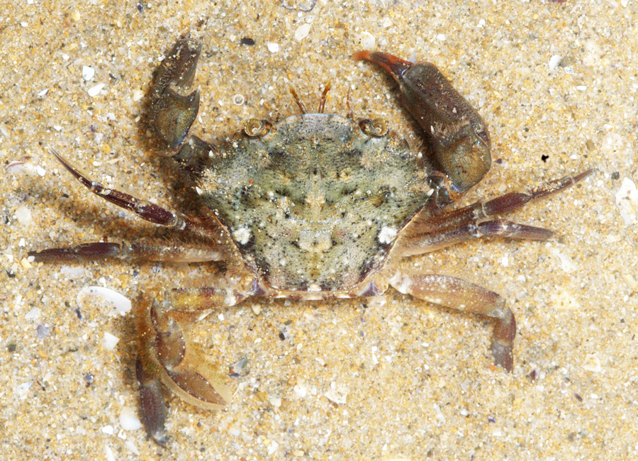 Caratteri distintivi: lunghezza-larghezza del carapace 27,5x35,4 mm. Bordo frontale liscio ed arcuato, con una frangia di peli. Carapace con superficie più o meno granulosa e bordo antero-laterale con 5 denti (orbitario esterno compreso). Peli sul carapace e le zampe. Chelipedi con un forte dente nel bordo interno del carpo. Dattilo del V pereiopodio dilatato e natatorio (“a paletta”). Colore marrone chiaro, giallognolo o grigio.