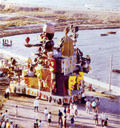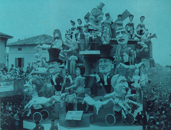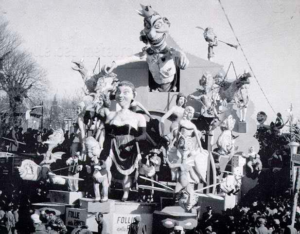 Carnevale 1957b. Carro ''Follie della Rivista'', di Pietro Pacassoni. Erano questi gli anni ''ruggenti'' dell'avanspettacolo al Politeama.