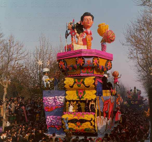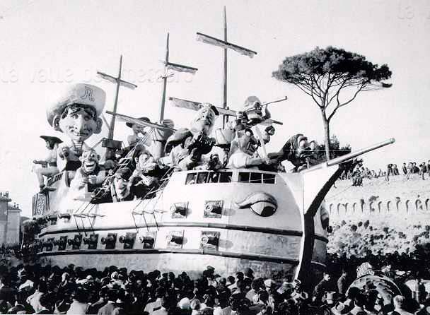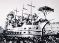 Carnevale 1955b. Carro ''Alvaro piuttosto corsaro'', di Vittorio Corsaletti- 1° premio. L'attore Renato Rascel dal palcoscenico della rivista al Carnevale di Fano