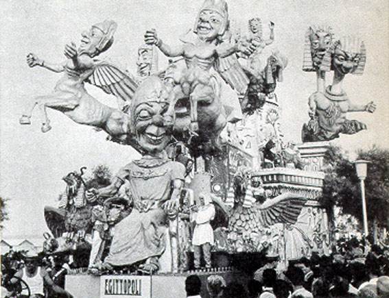 Carnevale 1959. Carro "Egittopoli" (o "Le prime meraviglie"), di Enzo Bonetti - 3° premio. Da: "Città di Fano", Anno II, n.1, 2 febbraio 1980.