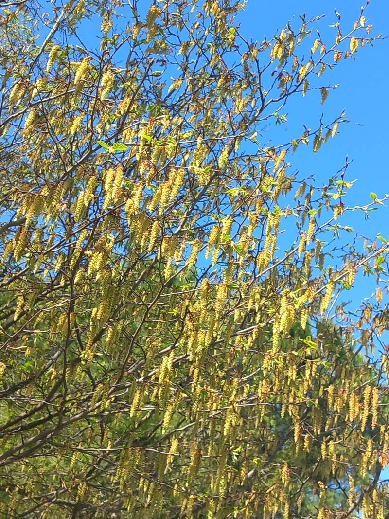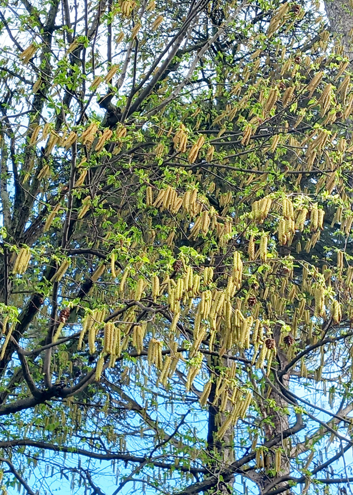 Carpino nero (Ostrya carpinifolia) con amenti maschili, giardino alla periferia di Fano, fine marzo 2025
