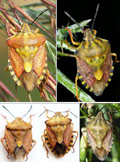 Carpocoris pudicus, a sx: area erbosa dello Stagno Urbani lungo il Metauro a Fano, settembre 2011 (foto V. Dionisi); a dx: Urbino, giugno 2008 (foto J.M.I. Klaver); in basso a sx: Carpocoris pudicus, M. Nerone (foto M. Paglialunga); al centro: Carpocoris cfr. purpureipennis, Toscana (foto M. Paglialunga); a dx: Carpocoris purpureipennis, dintorni di Urbino, settembre 2021 (foto J.M.I. Klaver)