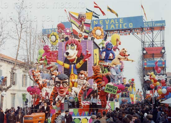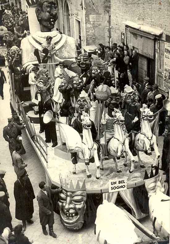 Carro ''Alla corte dei Malatesta. Il Mago Merlino predice: Globo, Globo delle mie brame, qual è ilpiù bel Carnevale del Reame?'', di Alfredo, Giorgio, Pietro Pacassoni.