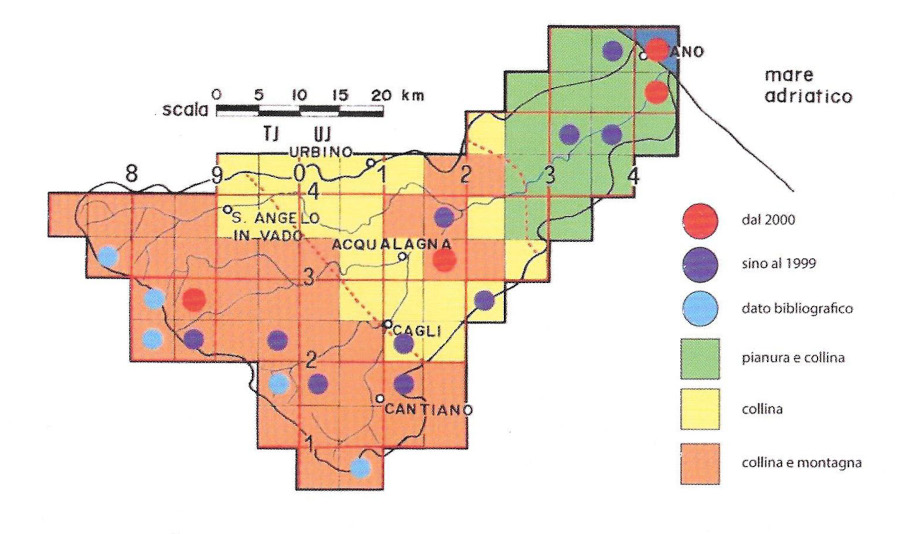 Carta di distribuzione (1974-2017) di Vitrea etrusca. I cerchi rossi con centro bianco indicano esemplari raccolti in posature