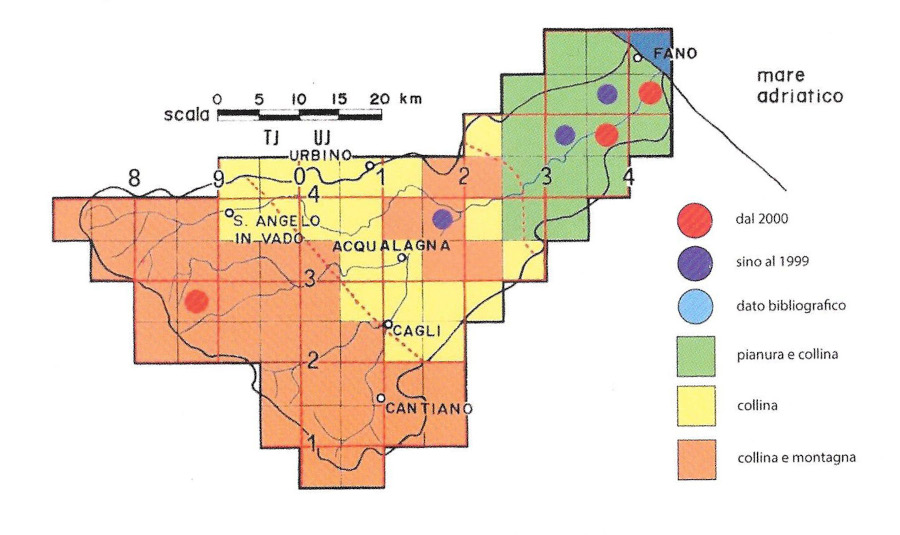 Carta di distribuzione (1974-2017) di Islamia pezzoliana. I cerchi rossi con centro bianco indicano esemplari raccolti in posature