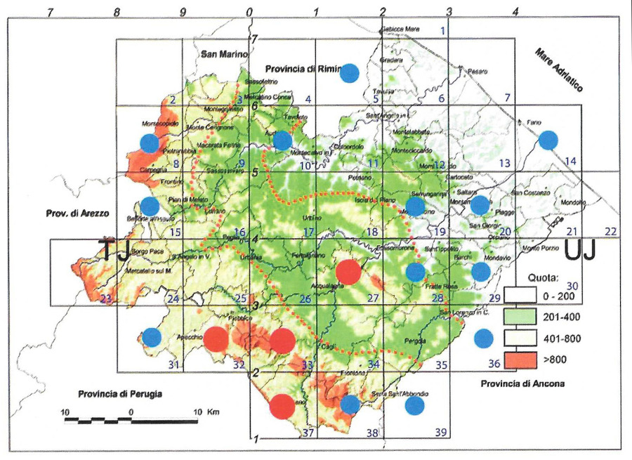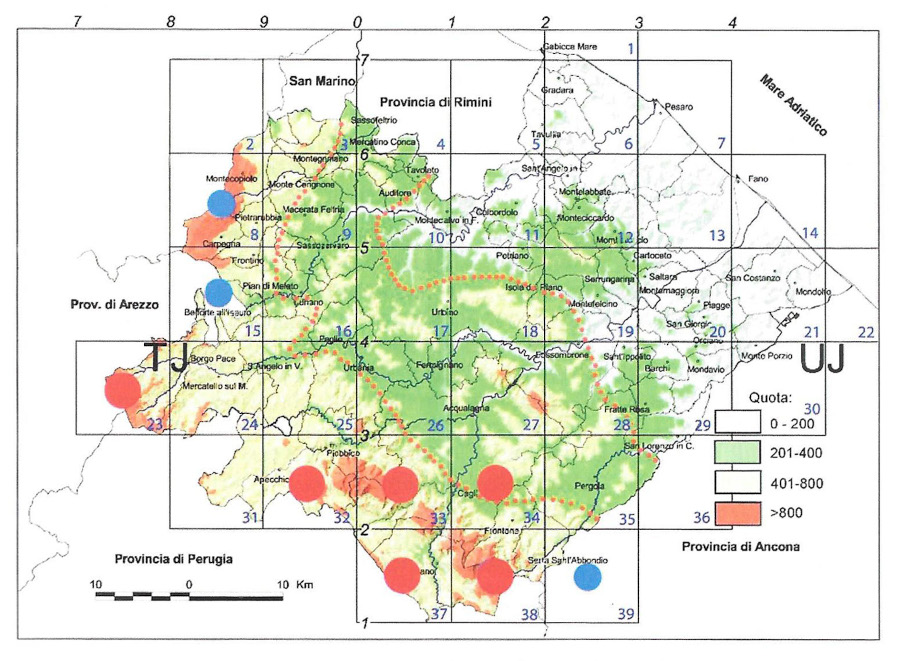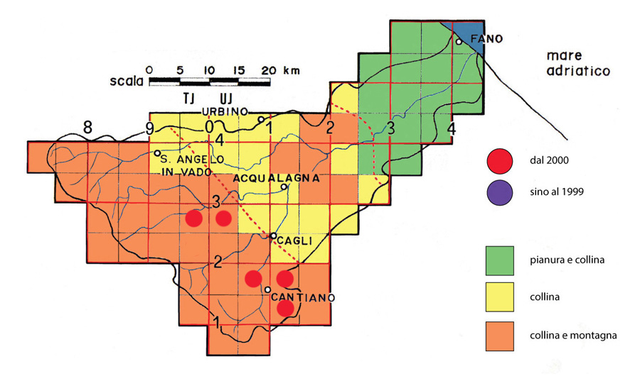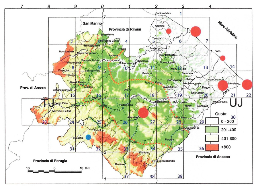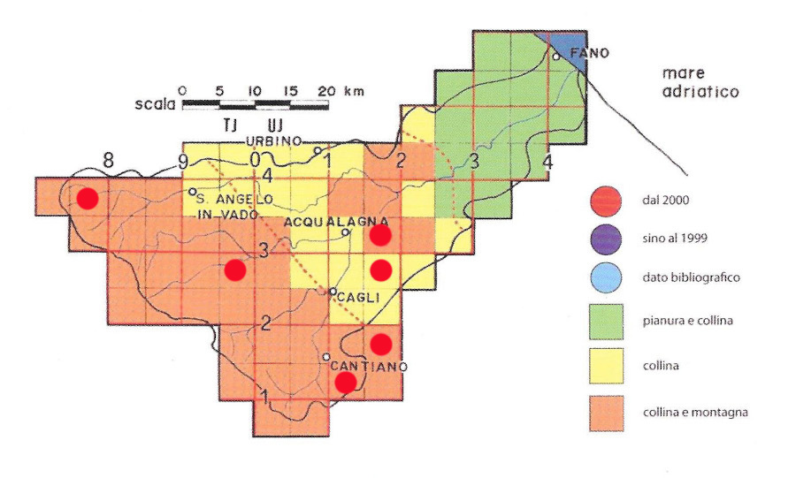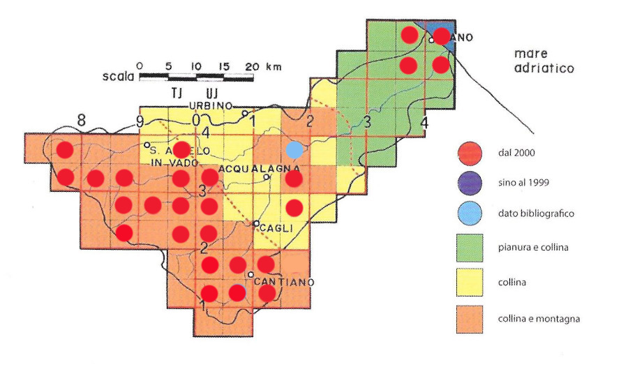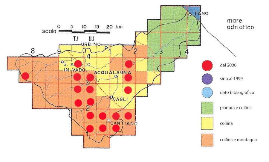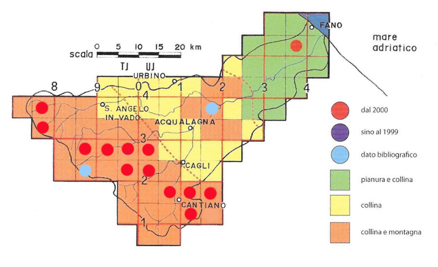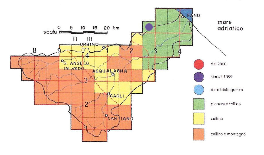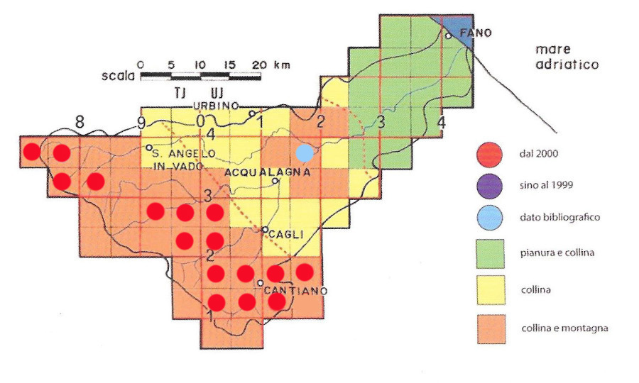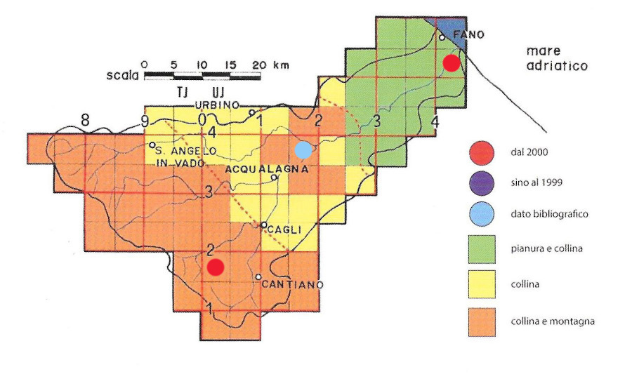 Carta di distribuzione di Emys orbicularis in Italia (da: BRUNO e MAUGERI 1977). Un pallino rosso è posizionato nel basso Metauro