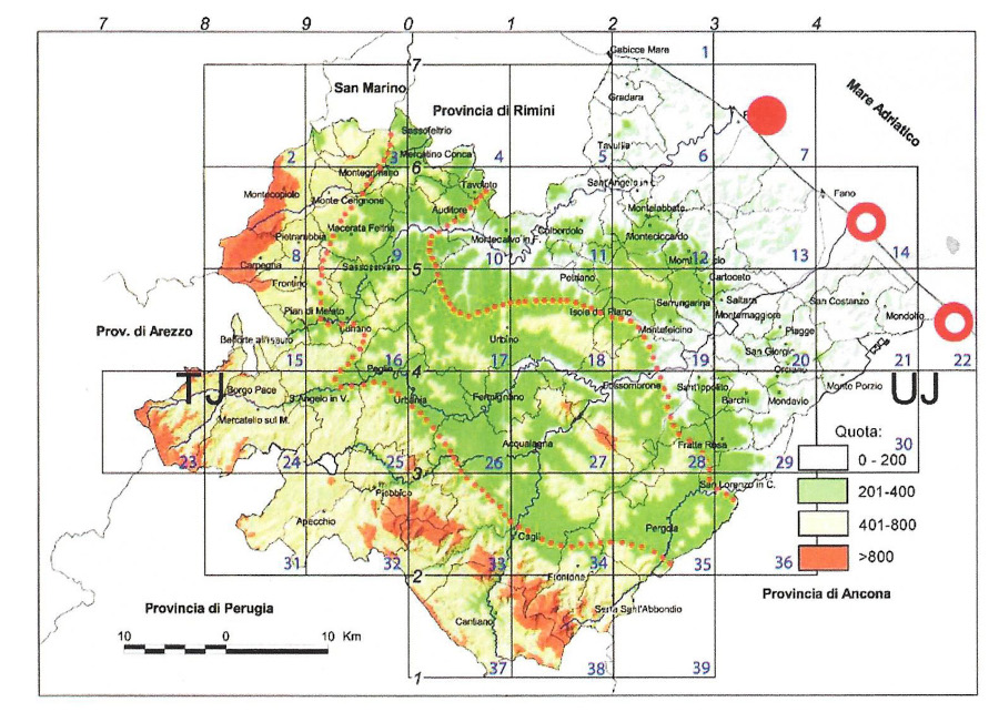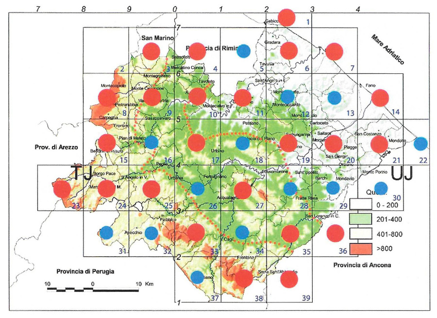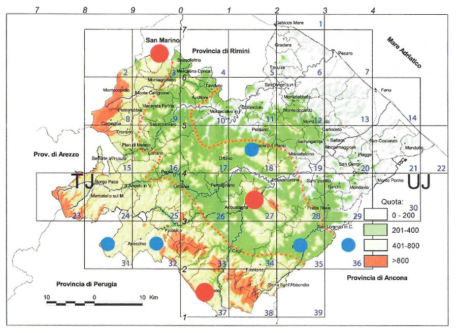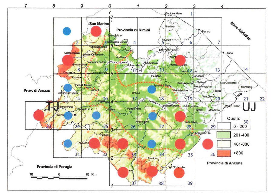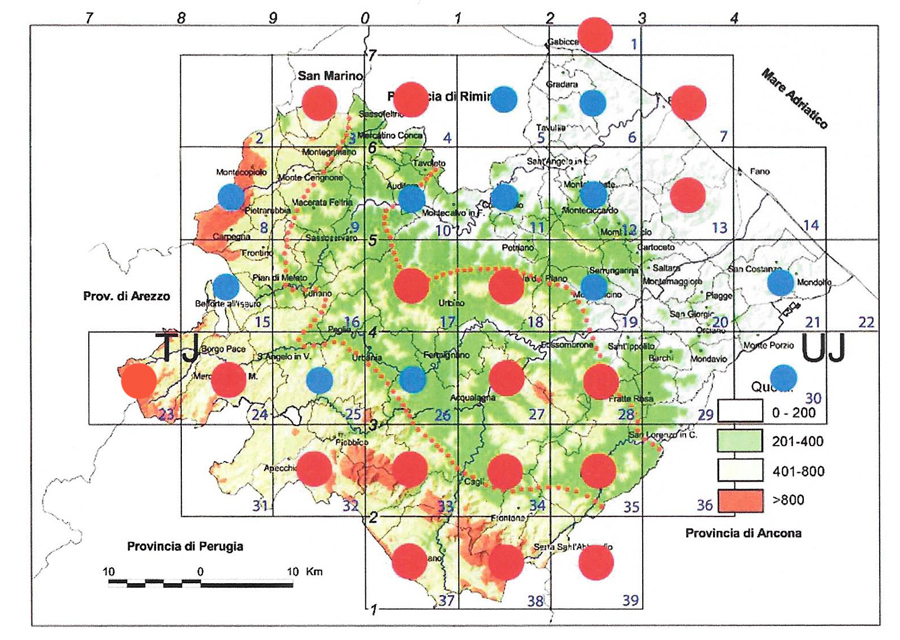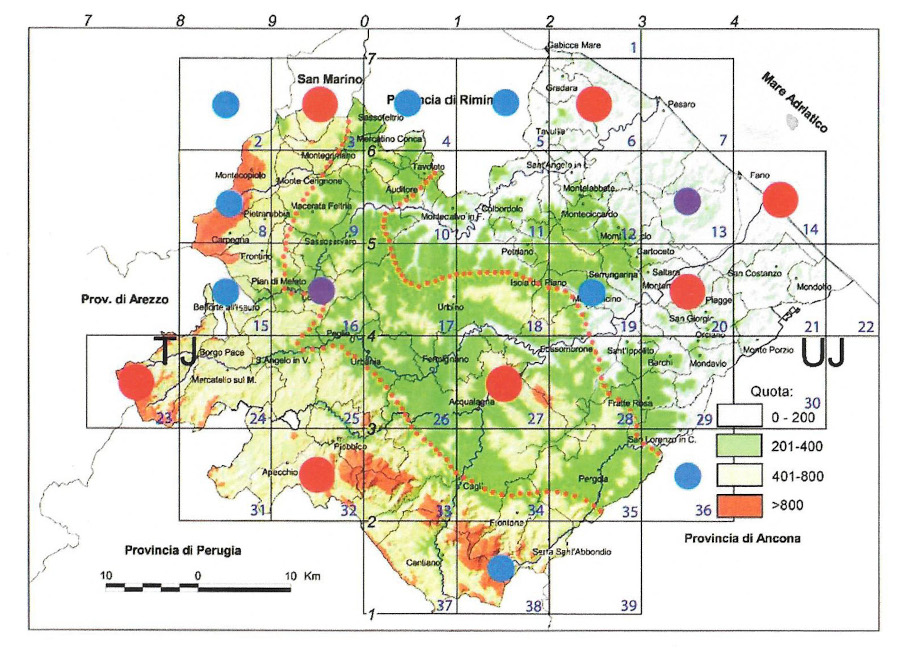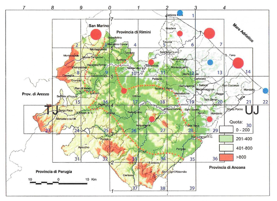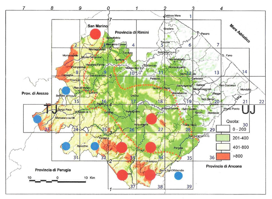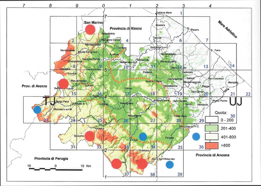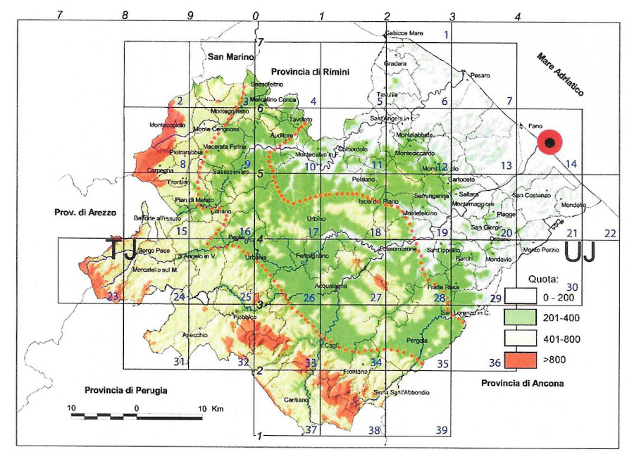 Carta di distribuzione di Emys orbicularis in Italia (da: BRUNO e MAUGERI 1977). Un pallino rosso è posizionato nel basso Metauro