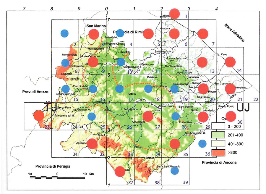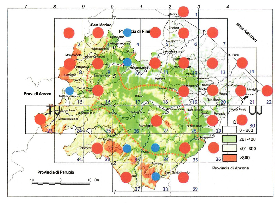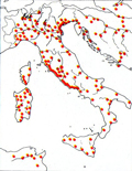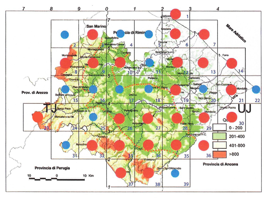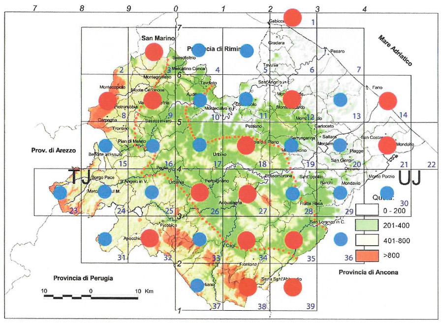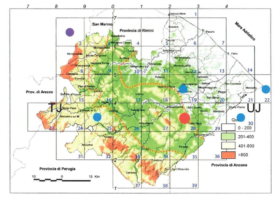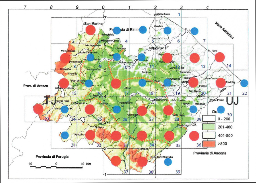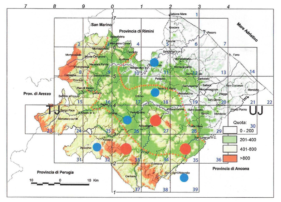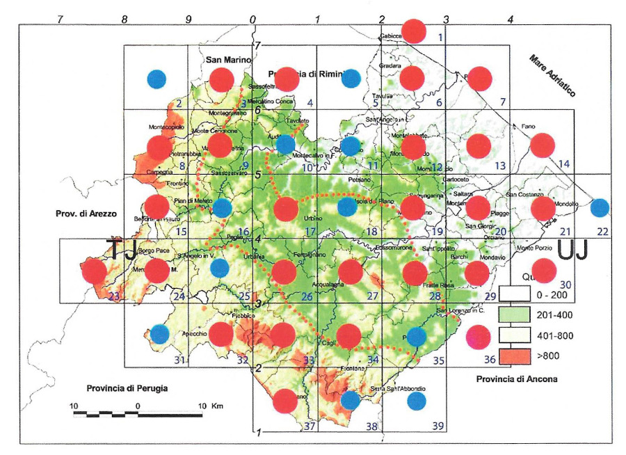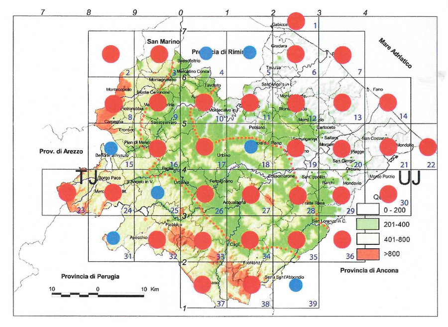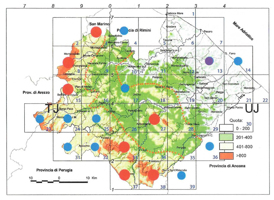 Carta di distribuzione di Emys orbicularis in Italia (da: BRUNO e MAUGERI 1977). Un pallino rosso è posizionato nel basso Metauro