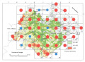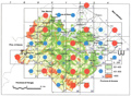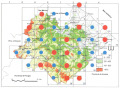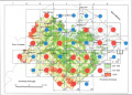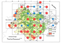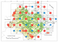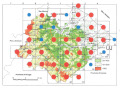 Carta di distribuzione di Geco comune, con presenza indicata sino al 2010 in azzurro, dal 2011 al 2020 in rosso. Cerchio più piccolo: dati di riferiti ad uno o a pochi esemplari non naturalizzati con certezza