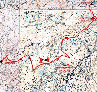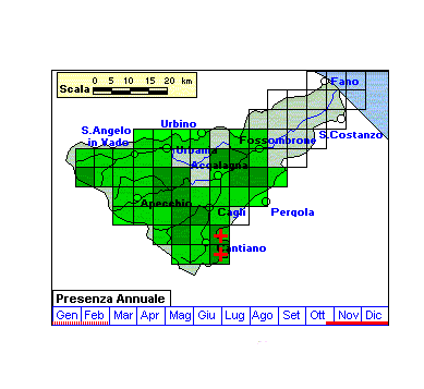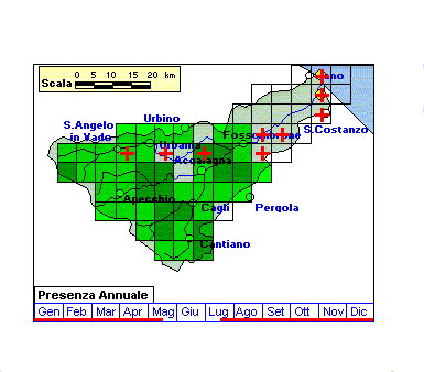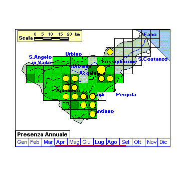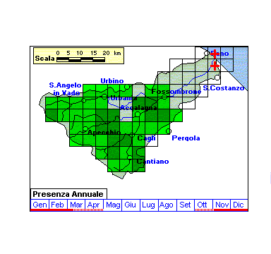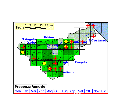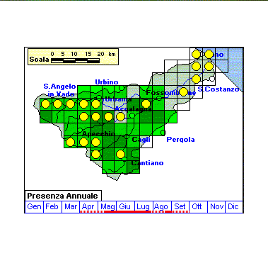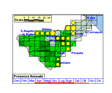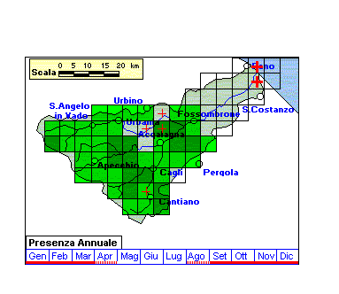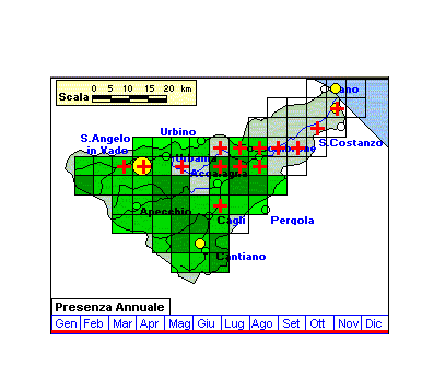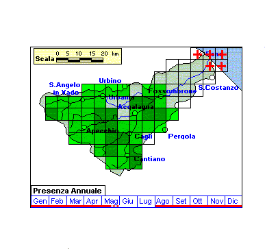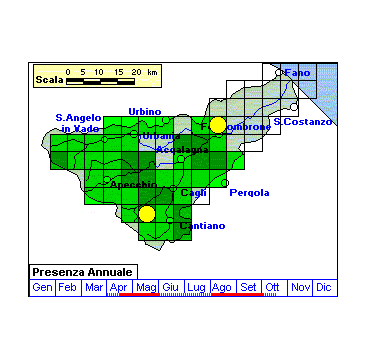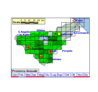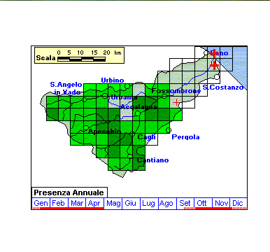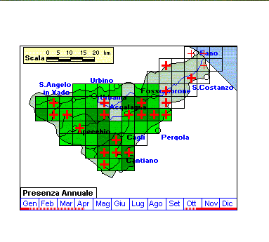 Carta di distribuzione dusata per i Mammiferi. I quadrati (riferiti al reticolo UTM) misurano 5x5 km, la linea nera ondulata continua delimita il bacino del Metauro, suddiviso a sua volta da linee rosse tratteggiate in tre sezioni: basso, medio e alto bacino o zona appenninica interna. I quadrati di colore verde rappresentano nel basso bacino la pianura e la collina (da 0 a 500 m di quota) con prevalenza di zone coltivate e urbanizzate; quelli gialli nel medio e alto bacino il fondovalle e la collina (da 200 a 800 m) con presenza di zone coltivate e boscate, in minor misura di zone urbanizzate; quelli marroni nel medio e alto bacino il fondovalle, la collina e la montagna (da 400 sino ai 1701 m del M. Catria) con prevalenza di boschi, arbusteti, praterie e zone con rocce affioranti