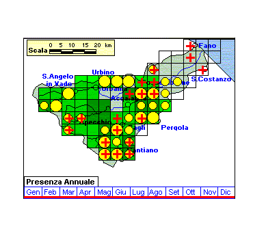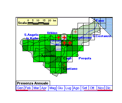 Carta di distribuzione, 1999. Legenda: cerchio grande = nidificazione certa; cerchio medio = nidificazione probabile; cerchio piccolo = nidificazione eventuale o estivazione; croce grande = presenza invernale; croce piccola = presenza invernale occasionale. Ulteriori notizie nella scheda "Come leggere le schede degli Uccelli''
