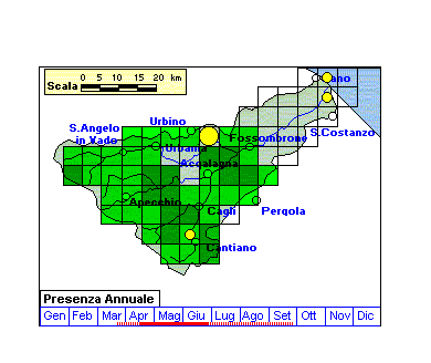 Carta di distribuzione, 1999. Legenda: cerchio grande = nidificazione certa; cerchio medio = nidificazione probabile; cerchio piccolo = nidificazione eventuale o estivazione; croce grande = presenza invernale; croce piccola = presenza invernale occasionale. Ulteriori notizie nella scheda: Come leggere le schede degli Uccelli