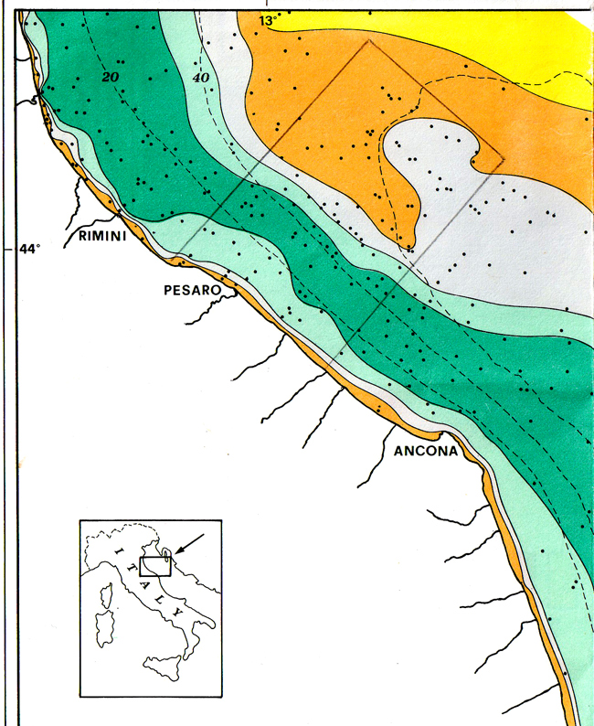 Carta sedimentologica dell'Adriatico centrale (da BRAMBATI et al. 1983, modificata), con evidenziata da una linea la zona di studio. Giallo = sabbia; arancio = sabbie pelitiche (sabbie litorali presso la spiaggia); grigio = peliti con molta sabbia; verde chiaro = peliti sabbiose; Verde scuro = peliti. I punti neri indicano la posizione di prelievo del sedimento