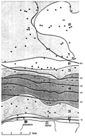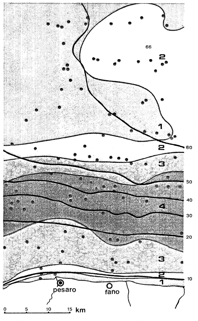 Carta sedimentologica della zona di studio (da BRAMBATI et al. 1983, modificata) 1 = sabbie pelitiche (sabbie litorali presso la spiaggia); 2 = peliti con molta sabbia; 3 = peliti sabbiose; 4 = peliti. Sono indicate le isobate, con a destra le profondità in metri; I punti neri indicano la posizione di prelievo del sedimento