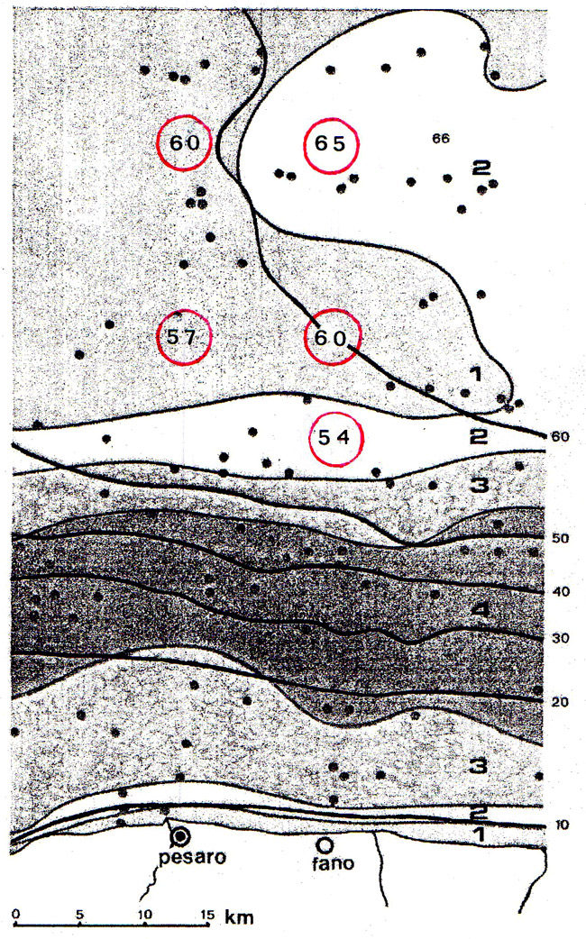 Carta sedimentologica della zona di studio (da BRAMBATI et al. 1983, modificata), con cerchiate in rosso le profondità in metri di alcuni punti di prelievo del detrito contenente molluschi. 1 = sabbie pelitiche (sabbie litorali presso la spiaggia); 2 = peliti con molta sabbia; 3 = peliti sabbiose; 4 = peliti. Sono indicate le isobate, con a destra le profondità in metri; I punti indicano la posizione di prelievo del sedimento