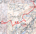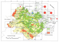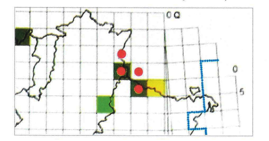 Carta di distribuzione con celle di 10x10 di Rana montana nell'Atlante degli Anfibi e dei Rettili della Toscana, segnate in verde scuro per dati a partire dal 1985, in verde chiaro per dati fino al 1984 compreso e in giallo per dati biblografici (da: VANNI & NISTRI, 2006, porzione di carta, anche modificata); la nostra zona di studio è situata ad est del limite indicato in blu. Sono state indicate in rosso le celle di presenza della specie nella carta di distribuzione dell'Atlante erpetologico dell'Emilia-Romagna (MAZZOTTI et al., 1999).