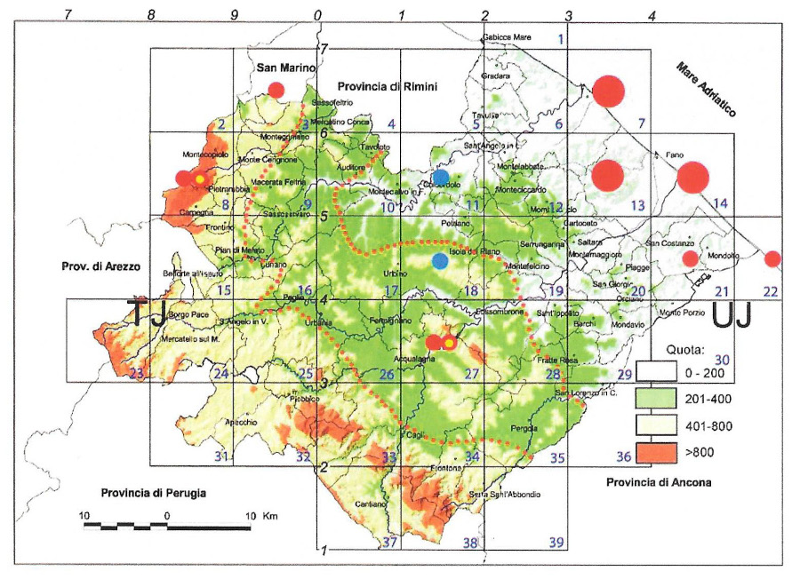 Carta di distribuzione usata per i Molluschi dulciacquicoli e terrestri. I quadrati (riferiti al reticolo UTM ED50) delimitati da linee rosse misurano 10x10 km e sono divisi in quattro da linee nere a formare quadrati di 5x5 km. La linea nera ondulata continua delimita il bacino del Metauro, suddiviso a sua volta da linee rosse tratteggiate in tre sezioni: basso bacino, medio bacino e zona appenninica interna o alto bacino. I quadrati di colore verde rappresentano nel basso bacino la pianura e la collina (da 0 a 400 m di quota) con prevalenza di zone coltivate e urbanizzate; quelli gialli nel medio bacino e zona appenninica interna il fondovalle e la collina (da 200 a 800 m) con presenza di zone coltivate e boscate, in minor misura di zone urbanizzate; quelli marroni nel medio bacino e zona appenninica interna il fondovalle, la collina e la montagna (da 400 sino ai 1701 m del M. Catria) con prevalenza di boschi, arbusteti e zone con rocce affioranti