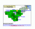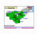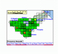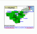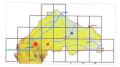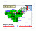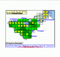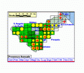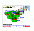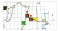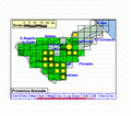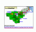 Carta di distribuzione usata per i Lepidotteri. I quadrati (riferiti al reticolo UTM) misurano 5x5 km, la linea nera ondulata continua delimita il bacino del Metauro, suddiviso a sua volta da linee rosse tratteggiate in tre sezioni: basso bacino, medio bacino e zona appenninica interna o alto bacino. I quadrati di colore verde rappresentano nel basso bacino la pianura e la collina (da 0 a 400 m di quota) con prevalenza di zone coltivate e urbanizzate; quelli gialli nel medio bacino e zona appenninica interna il fondovalle e la collina (da 200 a 800 m) con presenza di zone coltivate e boscate, in minor misura di zone urbanizzate; quelli marroni nel medio bacino e zona appenninica interna il fondovalle, la collina e la montagna (da 400 sino ai 1701 m del M. Catria) con prevalenza di boschi, arbusteti e zone con rocce affioranti