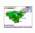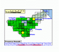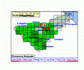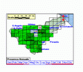 Carta di distribuzione usata per gli Odonati. I quadrati (riferiti al reticolo UTM) misurano 5x5 km, la linea nera ondulata continua delimita il bacino del Metauro, suddiviso a sua volta da linee rosse tratteggiate in tre sezioni: basso, medio e alto bacino o zona appenninica interna. I quadrati di colore verde rappresentano nel basso bacino la pianura e la collina (da 0 a 500 m di quota) con prevalenza di zone coltivate e urbanizzate; quelli gialli nel medio e alto bacino il fondovalle e la collina (da 200 a 800 m) con presenza di zone coltivate e boscate, in minor misura di zone urbanizzate; quelli marroni nel medio e alto bacino il fondovalle, la collina e la montagna (da 400 sino ai 1701 m del M. Catria) con prevalenza di boschi, arbusteti, praterie e zone con rocce affioranti