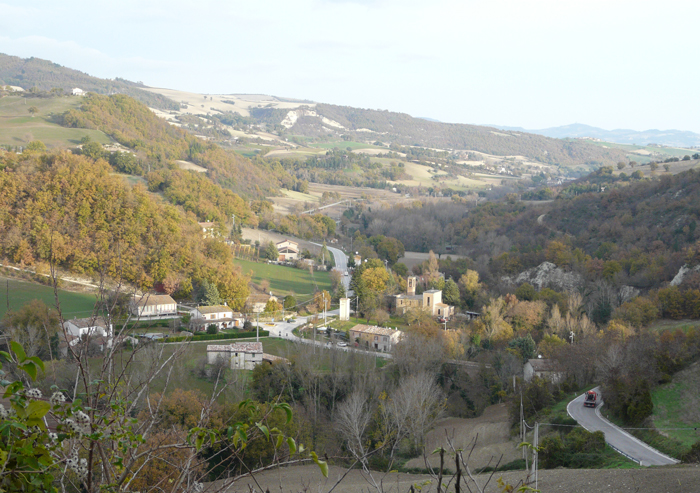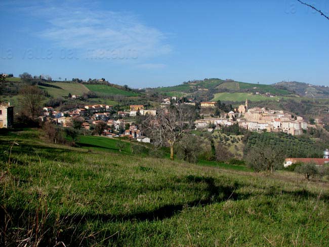 Cartina itinerario. Legenda: 1 - Cornice in ceramica a Palazzo Billi; 2 - dipinto Madonna della Consolazione nella Chiesa di S. Giovanni Apostolo a Marotta; 3 - Targhe in maiolica della Madonna di Ponte Metauro; 4 - Urna in pietra nell'Arco d'Augusto; 5 - Chiesa di S. Maria del Suffragio