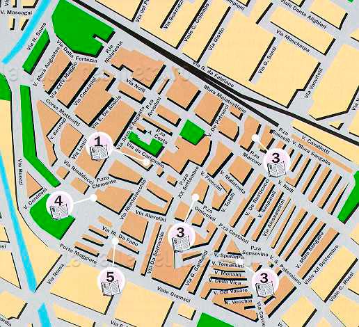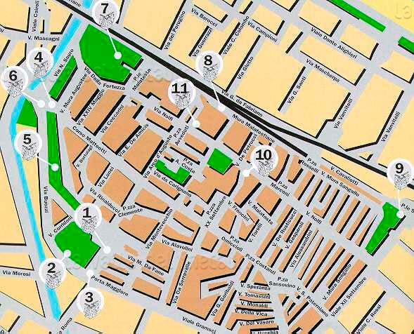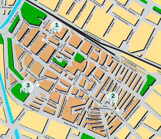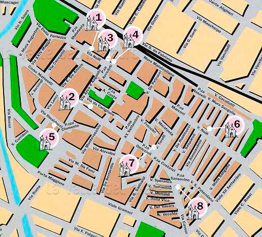 Legenda: 1 - Ex chiesa di S. Maria Maddalena. 2 - Ex chiesa dei Padri Girolomini. 3 - Ex chiesa di S. Maurizio. 4 - Torre di Sant'Elena. 5 - Ex chiesa del Gonfalone. 6 - Chiesa di S. Marco. 7 - Chiesa di S. Tommaso. 8 - Chiesa di S. Antonio Abate