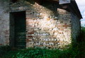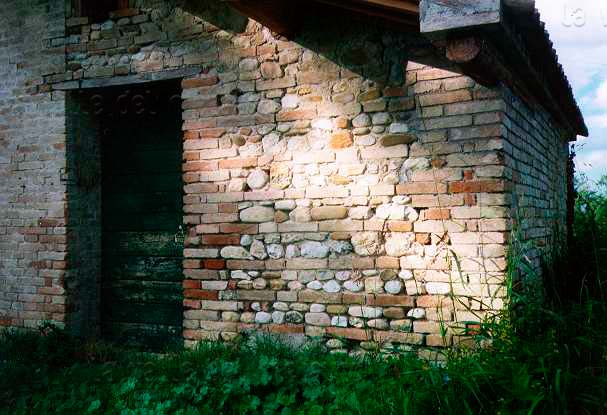 Casa Fonte Casciara, muratura della capanna. Si nota bene la muratura a ricorsi orizzontali di mattoni e sassi di fiume
