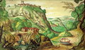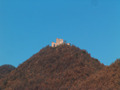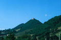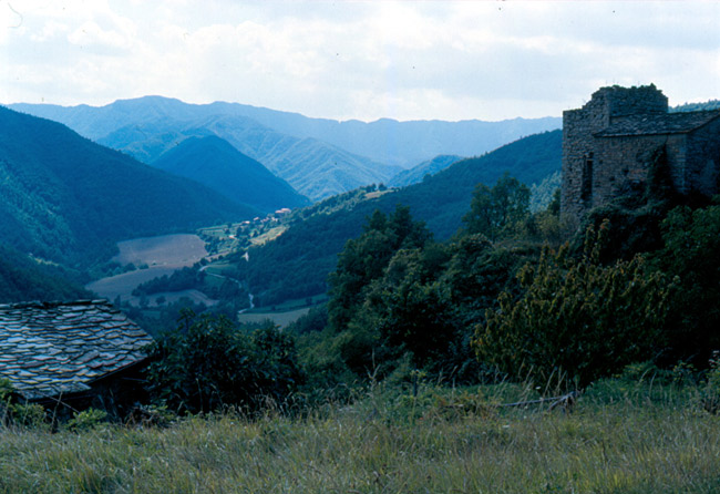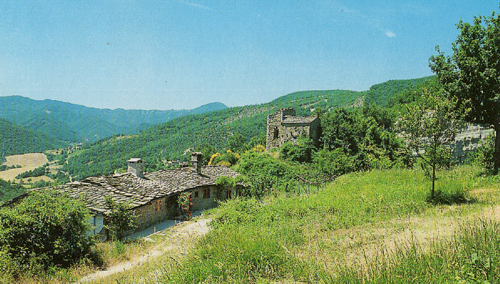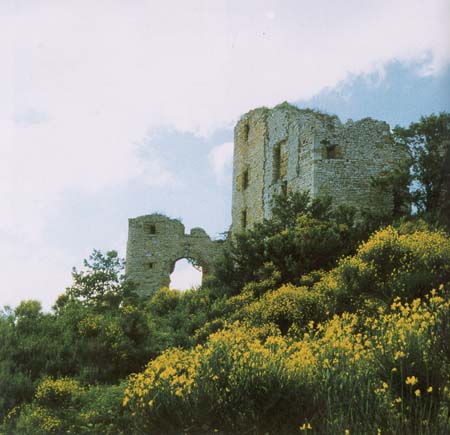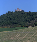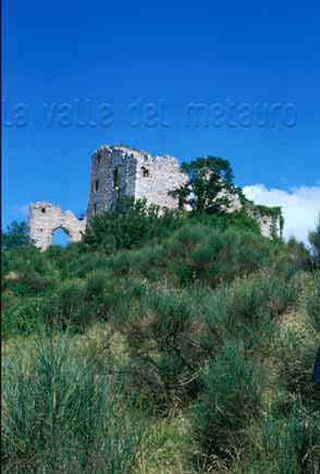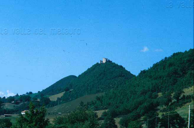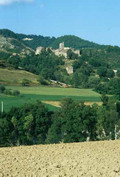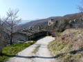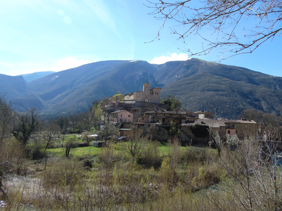 Castello dei Brancaleoni a Piobbico con sullo sfondo la valle dell'Infernaccio del Monte Nerone, marzo 2016