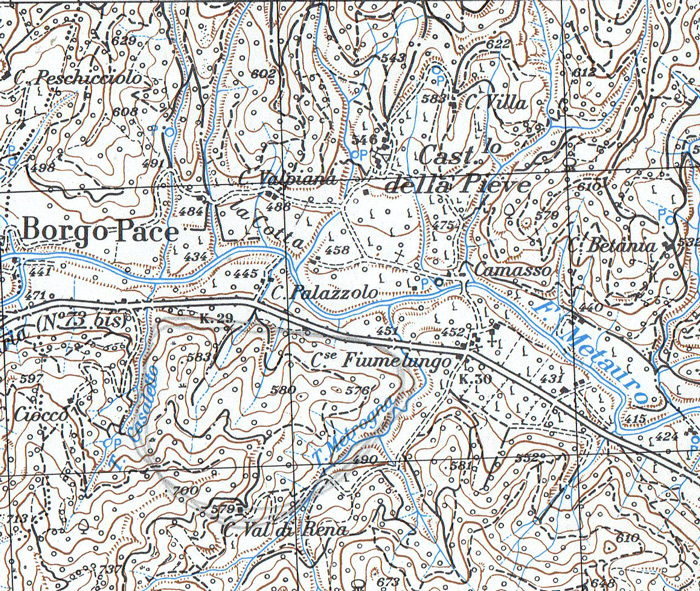 Castel della Pieve, Comune di Mercatello sul Metauro. Carta IGM 1:25.000 115 I N.O., rilevam. 1952 (autorizz. IGM n. 4877 del 2-11-1998)