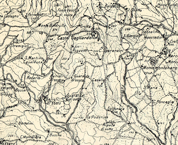 Castelgagliardo, Comune di Isola del Piano; Montemontanaro, Comune di Montefelcino. Carta IGM 1:25.000 109 II S.O., ricogn. 1948 (autorizz. IGM n. 4877 del 2-11-1998)