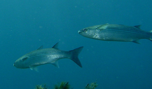 Cefalo dorato di 36 cm, particolare della bocca. Acque marine al largo di Cattolica, luglio 2006