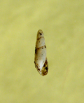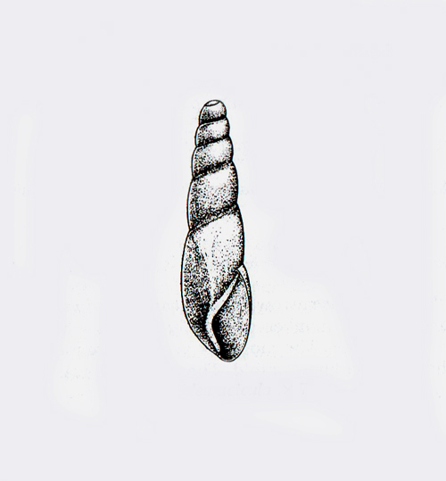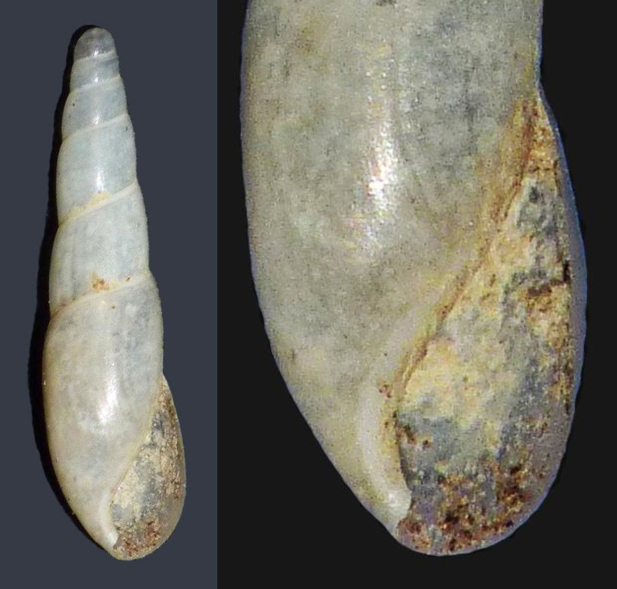 Cecilioides acicula di 5,5 mm, bosco ripariale del Metauro alla Palazzina (Sant'Ippolito), dicembre 2006. Nella foto a dx si vede la columella obliquamente tronca alla base