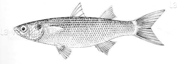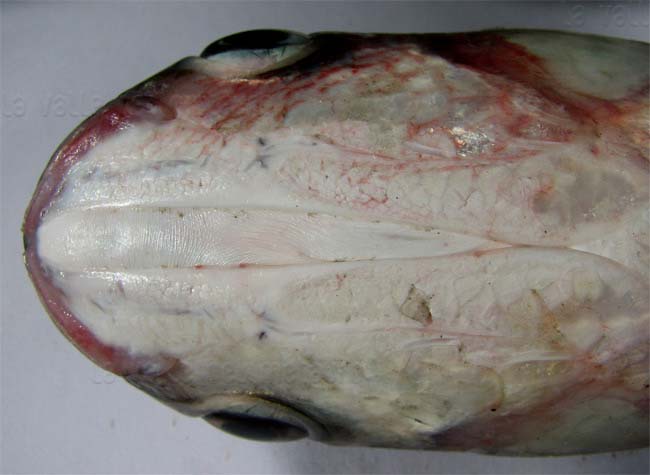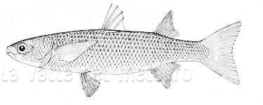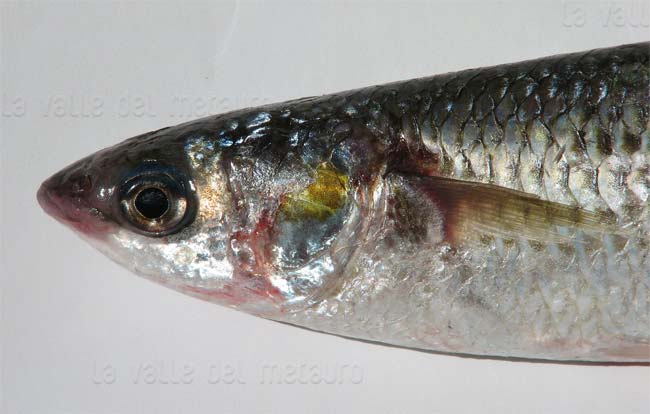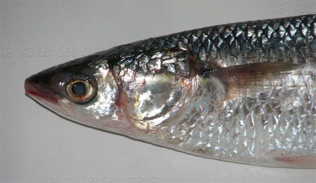 Cefalo calamita di 40 cm, spazio giugulare nella parte inferiore della testa. Pescherie di Fano, luglio 2006