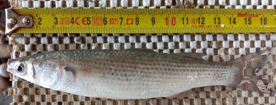 Cefalo comune (Mugil cephalus), F. Metauro a 3 km dalla foce, luglio 2023 (foto A. De Paoli, M. Sanelli e S.O. Bai, da: DE PAOLI et al., 2023)