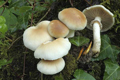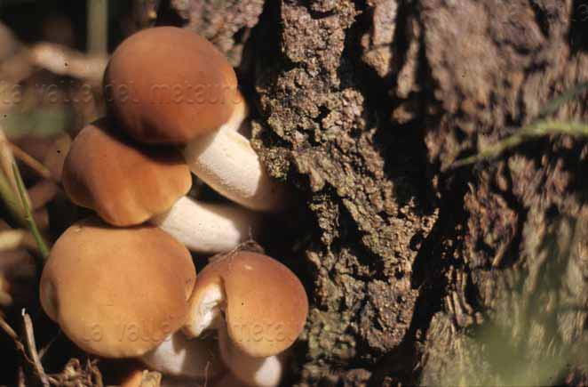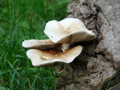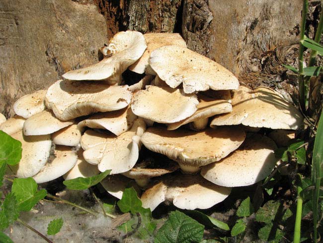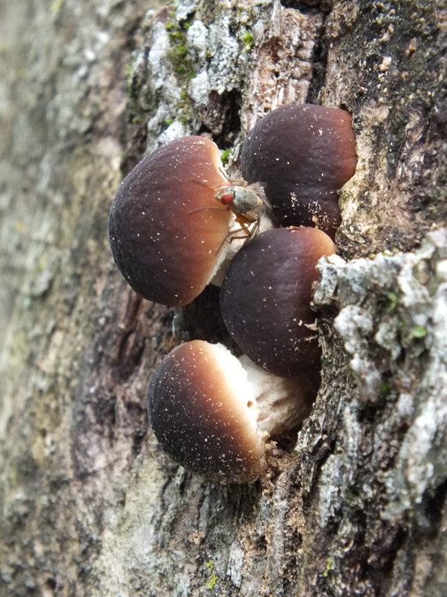Agrocybe aegerita appena spuntati da un pioppo tagliato, periferia di Fano, novembre 2012. Il Dittero visibile accanto si osserva spesso associato a questi funghi