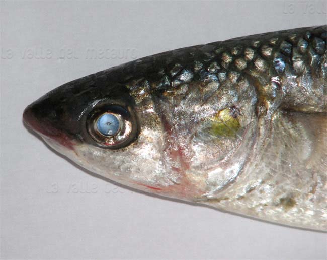 Cefalo verzelata di 25 cm, particolare della testa. Pescherie di Fano, giugno 2006
