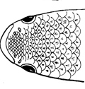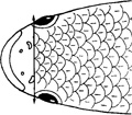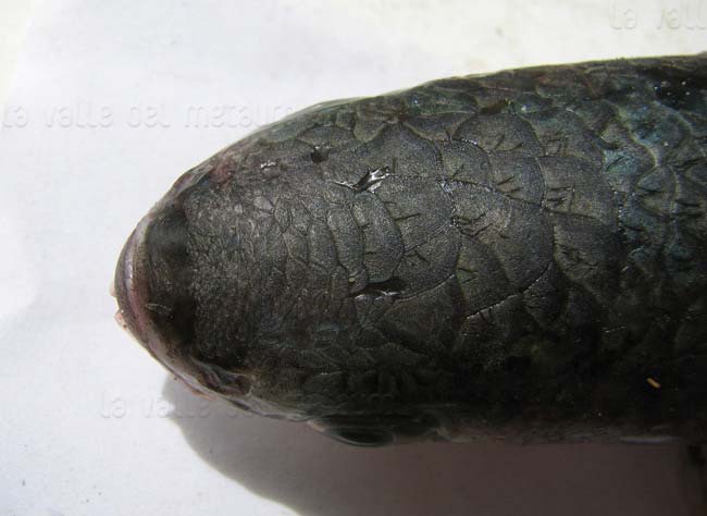 Cefalo verzelata, parte superiore della testa con spazio tra le due narici coperto di squame (da: FISCHER et al. 1987)