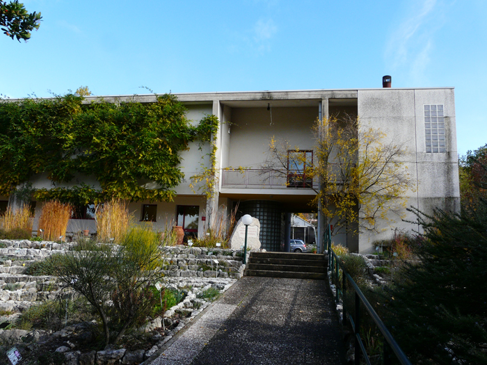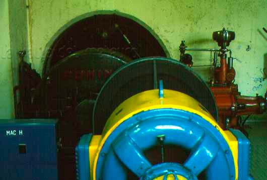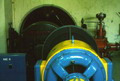 Centrale di Cerbara: primo gruppo. Si tratta di un gruppo ad asse orizzontale; sullo sfondo si trova la parete della vasca di carico; nella finestra circolare sono collocati i comandi del distributore. A destra si vede il regolatore oleodinamico, rosso, che comanda il flusso dell'acqua