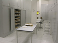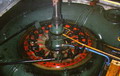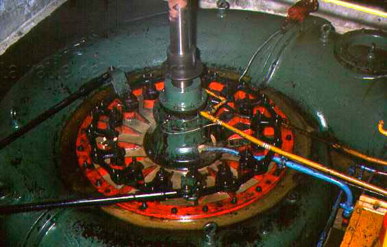 Centrale idroelettrica della Liscia a Fano: turbina verticale Kaplan. E' visibile la tubazione a "chiocciola" dell'arrivo dell'acqua in turbina e i comandi a catena del distributore. Anche questa turbina ha la possibilitŕ di variare il passo (l'inclinazione) delle pale dell'elica per adattarla alle esigenze di carico e alla disponibilitŕ di portata dell'acqua