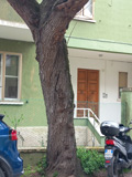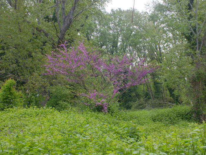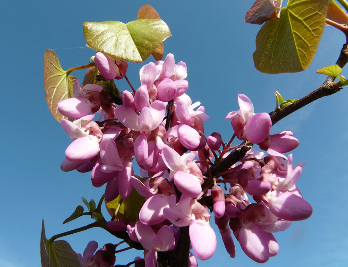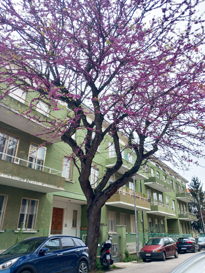 Cercis siliquastrum di circa 70 anni con tronco di circa 150 cm di circonferenza, strada alberata a Fano, fine marzo 2025