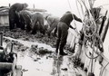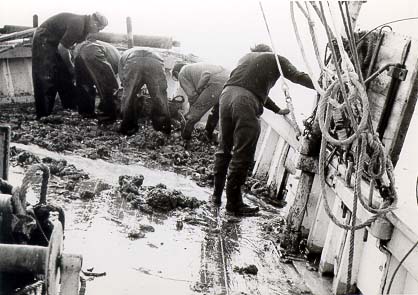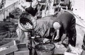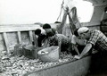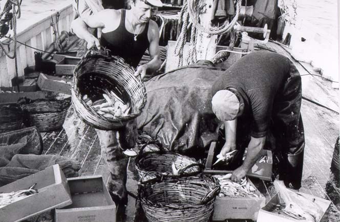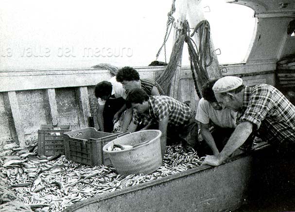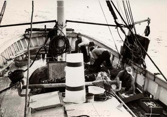 Cernita del pescato sul Peschereccio Alda Madre di Fano, Adriatico, 1967. Sulla destra il divergente, uno dei due tavoloni che mantiene l'imboccatura della tartana aperta durante la pesca